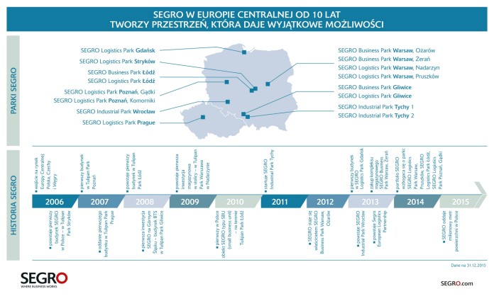 W ciągu tych 10 lat SEGRO zbudowało portfolio w Europie Centralnej – powstało 15 parków usytuowanych w 9 kluczowych lokalizacjach Polski oraz Czech. Nieruchomości zostały ulokowane w okolicy głównych węzłów komunikacyjnych oraz ośrodków transportowych takich jak porty czy lotniska.