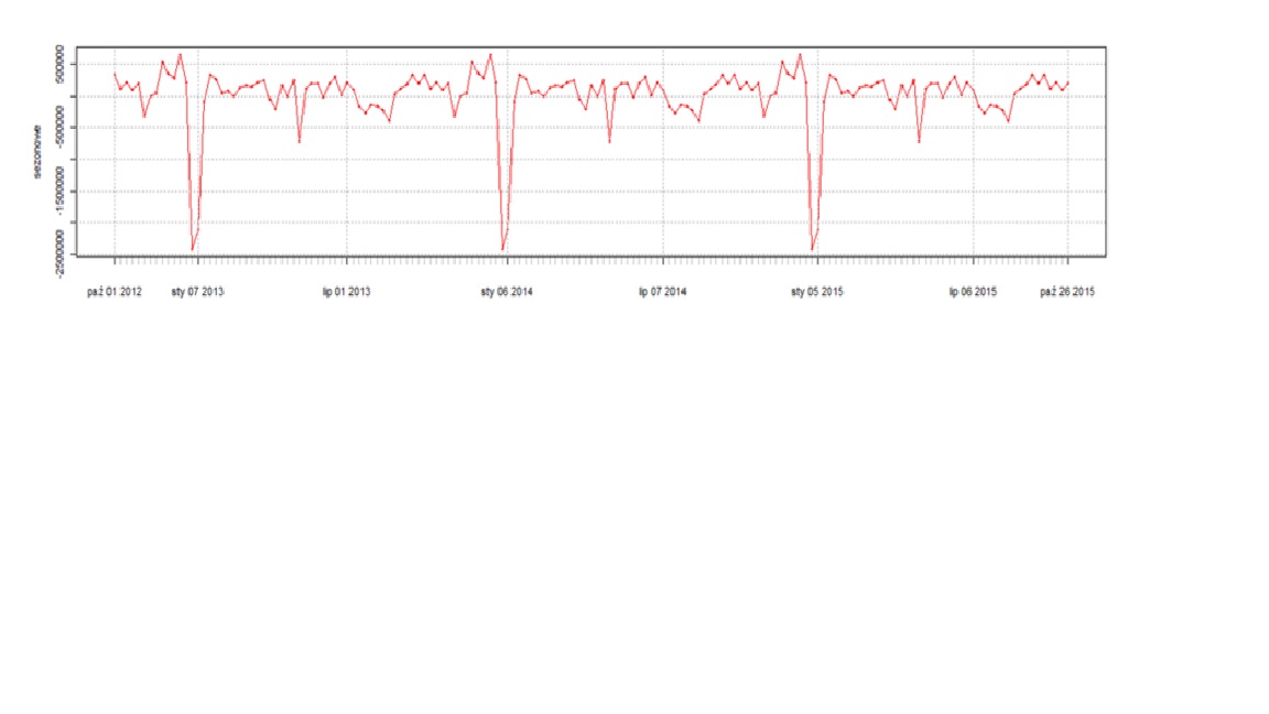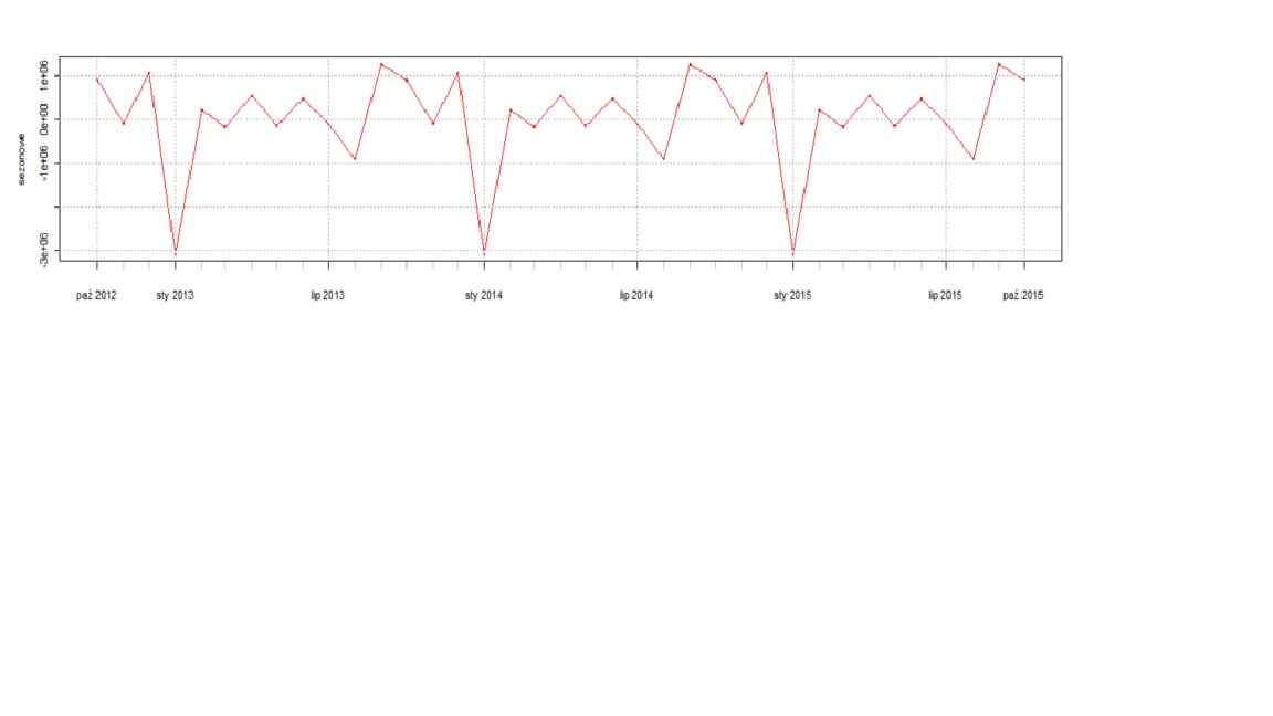 Wykres wahań sezonowych sugeruje istnienie dość regularnego wzoru powtarzającego się co 52 tygodnie (1 rok). Po początkowym minimum związanym z końcem poprzedniego roku następuje wzrost kumulujący się w tygodniach roku 3-cim i 4-tym. Następne tygodnie charakteryzują się dużą zmiennością a kolejne wyraźne maksima można zauważyć dopiero w tygodniu 25-tym (przełom czerwca i lipca). Tygodnie lipca i sierpnia to wyraźny spadek obrotów, po których następuje dość wyraźne odbicie w pierwszych tygodniach września (tyg. 36-37). Początek czwartego kwartału to kolejny spadek obrotów, po którym następuje roczne maksimum w tygodniach 47,48 oraz 49 i spadek obrotów w ostatnich tygodniach roku.