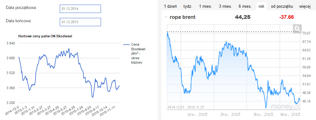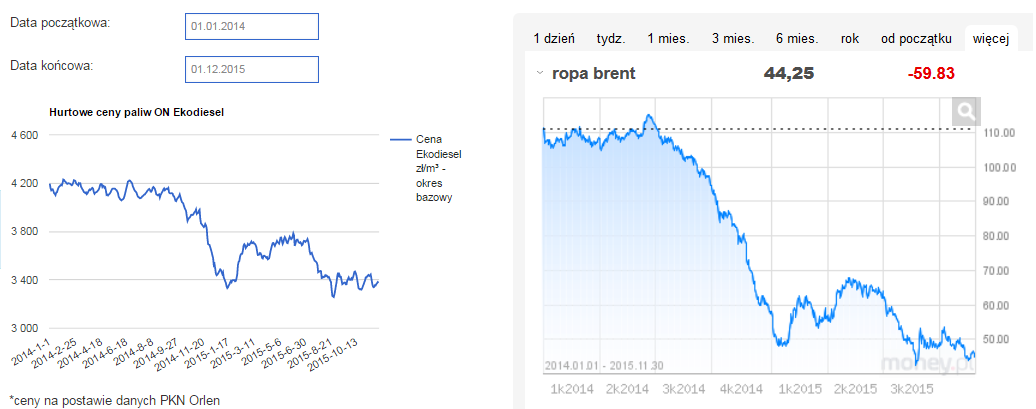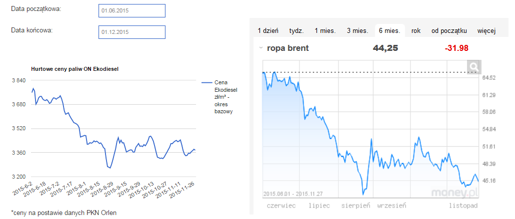Powyższe wykresy przedstawiają wysoką korelację między hurtowymi cenami paliw a światową ceną ropy naftowej. Obecnie cena czarnego złota jest na historycznie niskim poziomie a 21 sierpnia w Stanach Zjednoczonych spadła poniżej bariery psychologicznej 40 dol. za baryłkę. Niskie ceny surowca w dużej mierze są uwarunkowane jego światową nadprodukcją oraz przepychankami ekonomicznymi między państwami OPEC a Rosją.