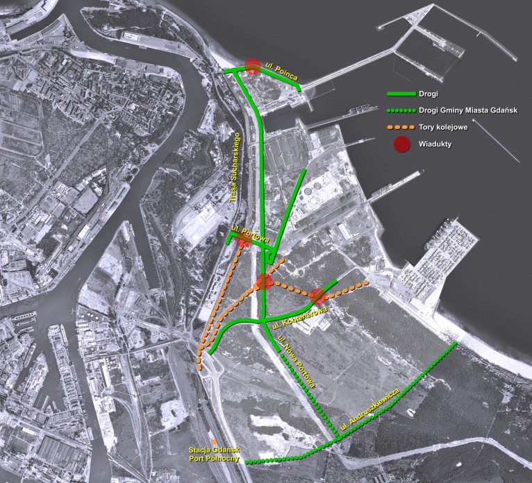 [Powiększenie] Całe przedsięwzięcie dopełnione zostanie także inwestycjami zaplanowanymi przez Gminę Miasta Gdańska, które koncentrować się będą wyłącznie na poprawie dostępności drogowej. W ramach tego przedsięwzięcia Gmina przewiduje bowiem budowę ciągu dwóch ulic tj. ulicy Nowej Portowej oraz prostopadłej doń obecnej ul. Andruszkiewicza, której bieg postanowiono wydłużyć aż do terminalu kontenerowego wzdłuż Pomorskiego Centrum Logistycznego.