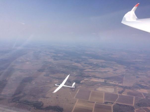 Po stracie pierwszy dobry komin ok. 4 m/s. Poczekałem na moich partnerów i odeszliśmy na północny-zachód. Podstawa noszeń już była bliska 4000 m i bez problemu lecieliśmy pod wiatr o sile 40-50 km/h. Warunki cały czas się poprawiały, a miejscami noszenia dochodziły nawet do 7 m/s. Po oddaleniu się 150 km od Narromine zawróciliśmy na południe i kontynuowaliśmy lot cały czas pod Cumulusami z bardzo dobrymi noszenia. Przelecieliśmy tak znowu ponad 150 km i zawróciliśmy ponownie na północ. Dzień już powoli się kończył i polecieliśmy na północ tyle ile się dało, aby mieć dolot z wiatrem do Narromine. W momencie zawrotki mieliśmy do lotniska 125 km i pokonaliśmy tę odległość z prędkością ok. 230 km/h. Prędkość względem ziemi momentami dochodziła do 300 km/h. W rezultacie przeleciałem ponad 530 km.