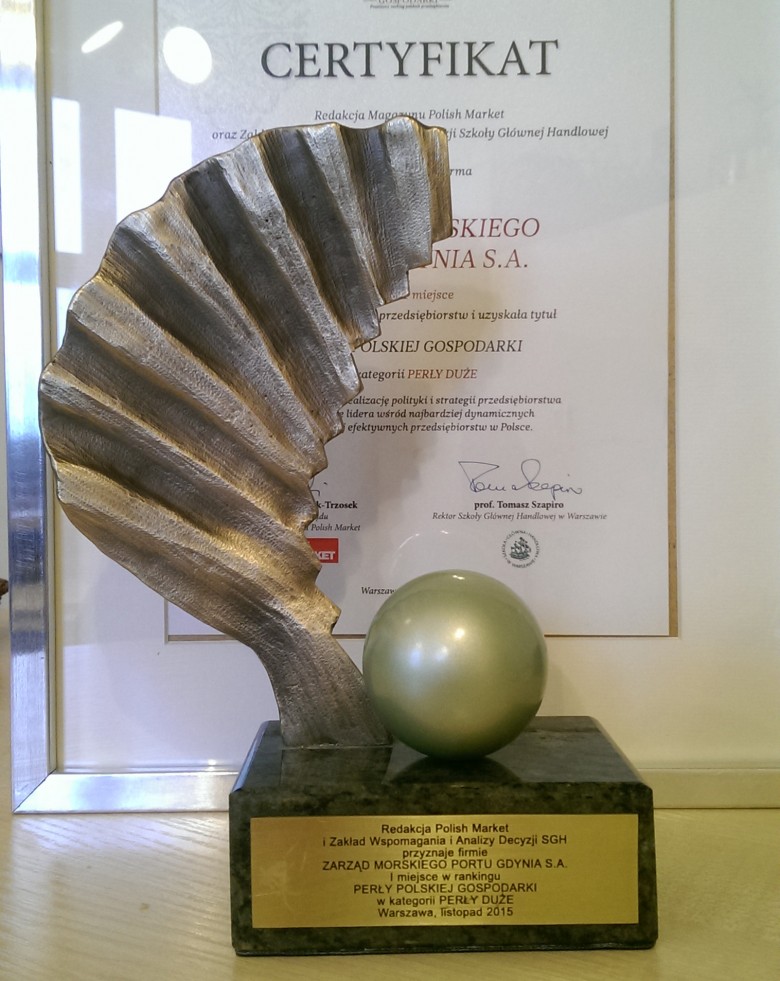 6 listopada br. w Sali Balowej Zamku Królewskiego w Warszawie odbyła się kolejna – trzynasta już Gala Pereł Polskiej Gospodarki. Podczas gali ogłoszono wyniki rankingu „Perły Polskiej Gospodarki 2015”. Zarząd Morskiego Portu Gdynia S.A. znalazł się na 1 miejscu w kategorii Perły Duże – tj. wśród przedsiębiorstw o przychodach rocznych od 100 mln do 1 mld zł.