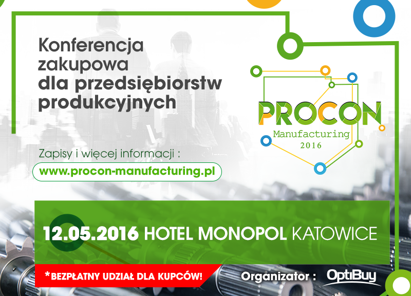 12 maja w hotelu Monopol w Katowicach odbędzie się konferencja zakupowa PROCON Manufacturing 2016, pierwsza w Polsce konferencja poświęcona zakupom w firmach z sektora przemysłowego. Udział w wydarzeniu dla kupców firm produkcyjnych jest bezpłatny. Zapisy prowadzone są na stronie www.procon-manufacturing.pl Liczba miejsc jest ograniczona, decyduje kolejność zgłoszeń. Patronat merytoryczny nad wydarzeniem objęło Polskie Stowarzyszenie Menedżerów Logistyki (PSML).