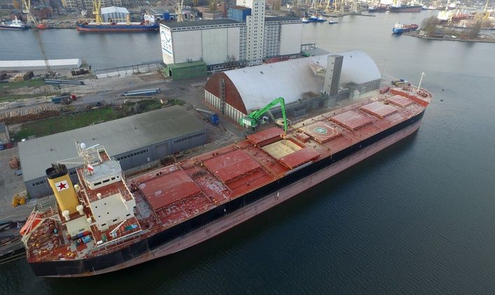 Statek przywiózł do Szczecina blisko 23 tys. ton śruty sojowej. Cumuje na Półwyspie Ewa przy nabrzeżu Słowackim.